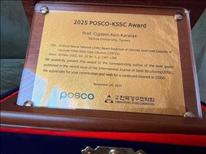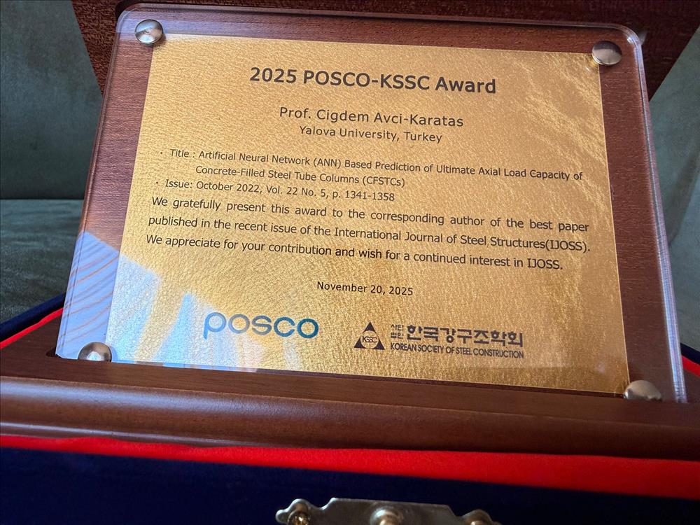 🏆 2025 POSCO–KSSC Best Paper Award, saygın International Journal of Steel Structures (Q2) dergisinde yayımlanan tek yazarlı çalışmasıyla Doç. Dr. Çiğdem Avcı Karataş’a verilmiştir.